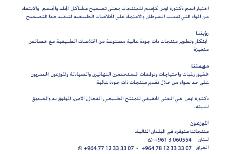 Choosing the name of Dr. Aws as a name for the products, meaning correcting skin and body problems, avoiding substances that cause cancer, and relying on natural extracts to carry out this correction.